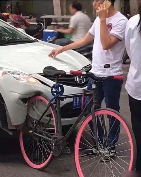 自行车被追尾啦,小轿车受伤了