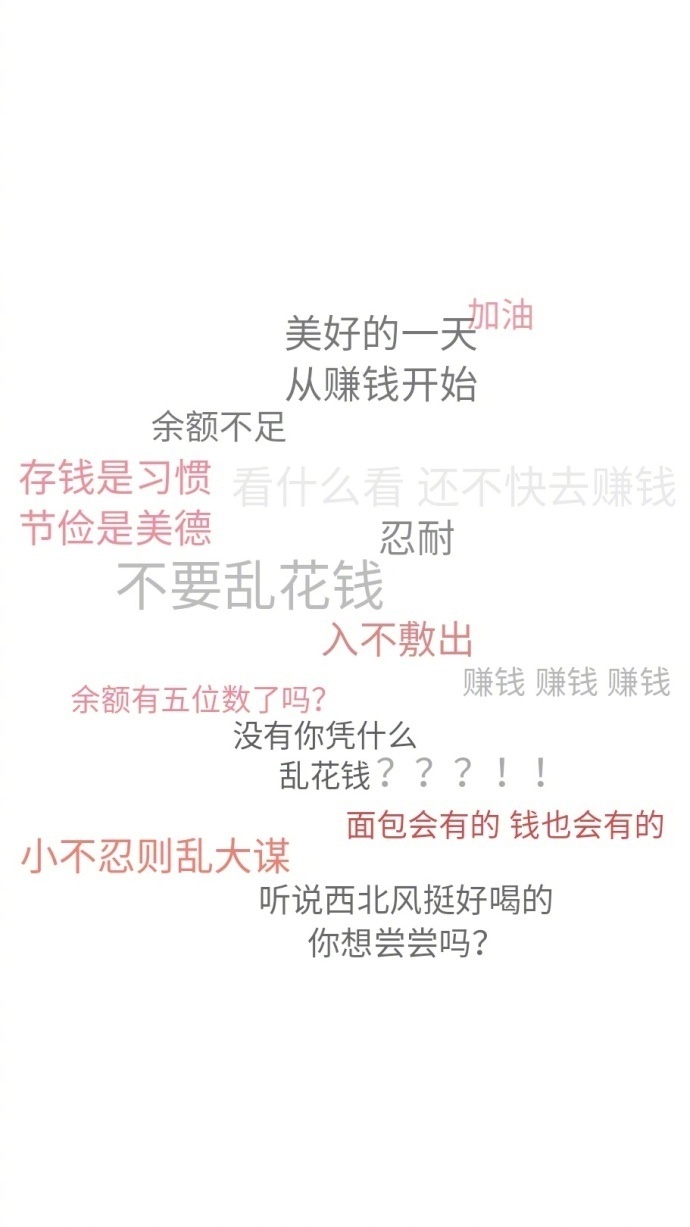 美好的一天油从赚钱开始余额不足存钱是习惯看什么看还不快去赚钱节俭是美德忍耐不要乱花钱入不敷出余额有五位数了吗?赚钱赚钱赚钱没有你凭什么乱花钱???!面包会有的钱也会有的小不忍则乱大谋听说西北风挺好喝的你想尝尝吗? 壁纸 纯文字 斗图啦 2026-03-10 10:04